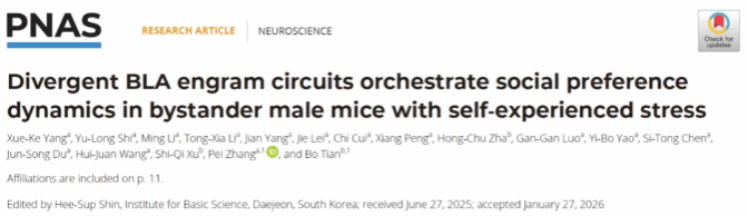 武科大网讯 近日,我校医学部田波团队与华中科技大学同济医学院张培团队在PNAS杂志在线发表了题为“Divergent BLA engram circuits orchestrate social preference dynamics in bystander male mice with self-experienced stress”的研究论文,揭示了源自基底外侧杏仁核(BLA)印迹细胞的神经环路调控社交偏好和社交回避行为的核心机制。